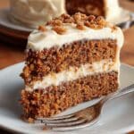 A slice of two-layer carrot cake sits on a white plate with a silver fork beside it. The bottom and top layers are dense and moist, with a rich brown color speckled with small bits as texture. Between and above the layers is thick, creamy white frosting, generously spread, creating clean, smooth surfaces. The top frosting layer is topped with small, crumbly pieces of cake as decoration. The plate rests on a warm-toned wooden surface with a blurred whole cake in the background. Photo taken with an iphone --ar 4:5 --v 7