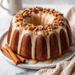 - Ice the cake: While the icing is still pourable, drizzle it over the cooled cake. If using, sprinkle the finely chopped toasted or candied pecans immediately so they stick before the icing sets.