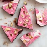 7. Add Toppings and Swirl: Sprinkle the chopped almonds evenly on top. Use a butter knife to swirl the white and pink chocolates together, creating a marbled effect. Sprinkle flaked sea salt and, if desired, a little extra chipotle chile powder on top.