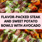 These Steak and Sweet Potato Bowls with Avocado combine tender, marinated flank steak, roasted sweet potatoes, fresh greens, and creamy avocado-cilantro drizzle over a bed of white rice. Perfect for a nutritious and flavorful meal that balances savory, sweet, and tangy flavors with a vibrant presentation.