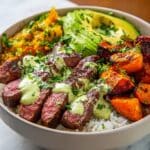 These Steak and Sweet Potato Bowls with Avocado combine tender, marinated flank steak, roasted sweet potatoes, fresh greens, and creamy avocado-cilantro drizzle over a bed of white rice. Perfect for a nutritious and flavorful meal that balances savory, sweet, and tangy flavors with a vibrant presentation.