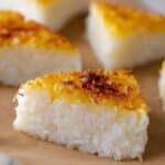 This Sticky Coconut Cake is a luscious, rich dessert made with glutinous rice flour, sweetened shredded coconut, and full-fat coconut milk, producing a moist, chewy, and sweet treat. The cake is baked until set and then topped with egg yolks that caramelize under the broiler for a golden finish. It’s best served chilled or at room temperature, making it a perfect tropical-inspired dessert for any occasion.