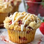 Keywords: strawberry muffins, cream cheese muffins, crumb topping, breakfast muffins, glazed muffins, fresh strawberries