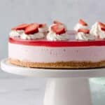 - Serve the Cake: Optional: Pipe homemade whipped cream swirls on top before serving. To remove the cake, run a lightly oiled knife around the edge of the springform pan to loosen. Release and remove the pan ring, then transfer the cake carefully to a serving platter. Slice and enjoy this beautifully creamy strawberry mousse cake!