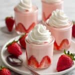 The image shows four small glass jars filled with a creamy pink dessert, each jar lined inside with strawberry slices around the base, creating a red and translucent layer. The pink creamy middle layer is smooth and thick, topped with a swirl of white whipped cream. The jars are placed on a white plate, with whole fresh strawberries scattered around and a silver spoon resting on the plate’s edge. The setting is on a white marbled surface. photo taken with an iphone --ar 4:5 --v 7