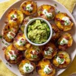 Tasty Mini Potato Skins featuring crispy roasted Yukon Gold potatoes loaded with a buttery, cheesy mashed potato filling, topped with crispy bacon, sour cream, and fresh chives. Perfect as a savory appetizer or snack, these potato skins are baked to golden perfection with a delightful texture and robust flavors.