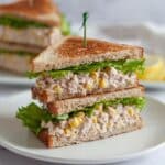 A toasted sandwich cut into two triangular pieces is stacked on a white plate. It has three layers of light brown toasted bread with a crispy texture. Between the bread layers, there is a thick filling of tuna salad mixed with corn kernels, giving a creamy pale pink color with yellow spots. Fresh, green leafy lettuce is tucked beneath the filling on both layers. A small green-tipped toothpick stands upright through the sandwich center, holding it together. The background shows another sandwich on a white plate against a white marbled surface. Photo taken with an iphone --ar 4:5 --v 7