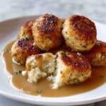 - Serve: Top the hot turkey stuffing balls with warm gravy. Optionally, add a side of cranberry sauce for a classic holiday touch. Serve immediately to enjoy the best texture and flavor.