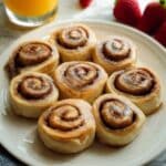 Seven cinnamon rolls are placed in a round white plate with a swirl pattern on its surface. Each roll has a light golden outer layer with a soft doughy texture and is tightly rolled showing dark brown cinnamon filling spiraled inside. Some rolls have a light glaze on top, giving a slight shine and a hint of sugary coating. The plate is set on a white marbled surface with fresh bright red strawberries to the left and a blurred glass of orange juice in the background. photo taken with an iphone --ar 4:5 --v 7