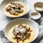 - Serve: Season the polenta with additional salt to taste if needed. Serve the creamy polenta in bowls, top with the roasted mushrooms, and garnish each bowl with a sprig of fresh thyme. Optionally, sprinkle grated vegan Parmesan on top (not included in nutrition count).