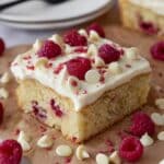 This White Chocolate Raspberry Traybake is a moist and fluffy cake bursting with fresh raspberries and creamy white chocolate chunks. Topped with a luscious white chocolate buttercream frosting and decorated with fresh and freeze-dried raspberries, this traybake is perfect for afternoon tea or dessert occasions.